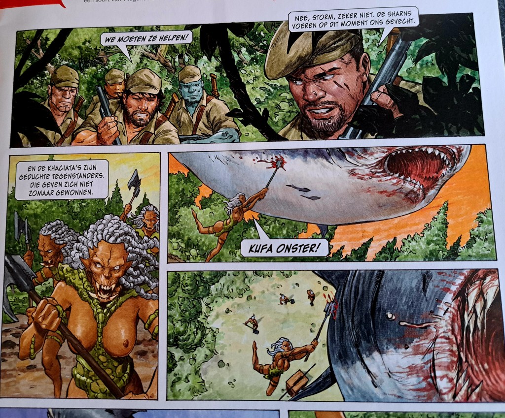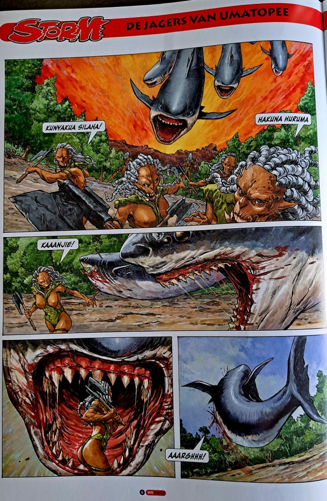 Op deze pagina’s worden Storm en zijn metgezellen aangevallen door vliegende haaien. Tekenaar Romano Molenaar heeft nog geen eens de moeite genomen om er iets origineels mee te doen; het zijn gewoon vliegende haaien met scherpe tanden. Van Bavel steekt op zijn beurt geen energie in een verklaring. Hoe kan het dat dergelijke wezens door de lucht vliegen? In plaats daarvan doet hij wel wat anders: hij geeft ze de naam ‘Sharns’ – een nogal flauwe toespeling op het Engelse ‘shark’.